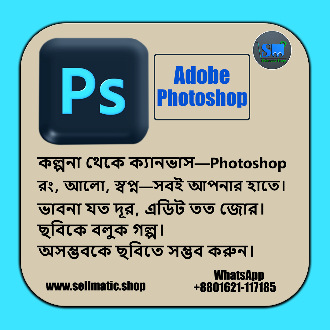 ফটো রিটাচ, ব্যানার/পোস্ট ডিজাইন, কম্পোজিট, প্রোডাক্ট মকআপ—সব কাজেই Adobe Photoshop হলো ইন্ডাস্ট্রি স্ট্যান্ডার্ড। আমাদের কাছ থেকে পাচ্ছেন প্রো–গ্রেড সেটআপ/গাইডসহ দ্রুত অ্যাক্সেস ও সাপোর্ট, যেন কাজ থেমে না থাকে।